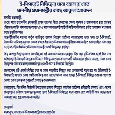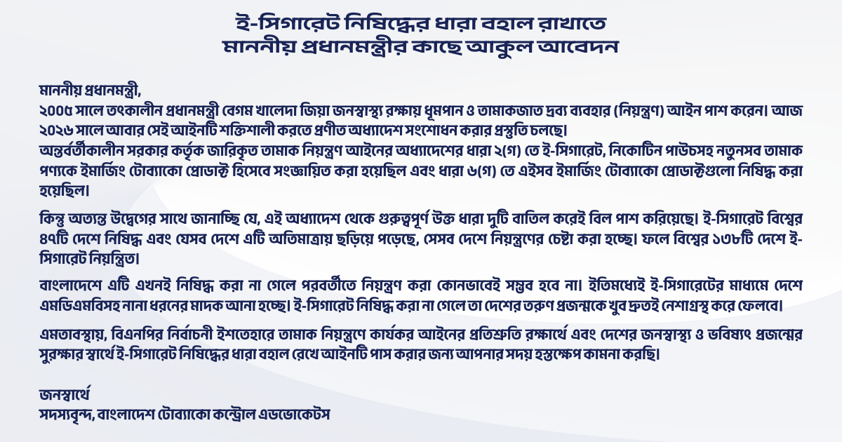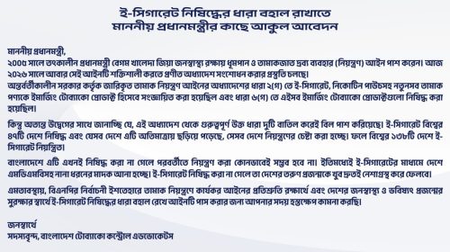 মাননীয় প্রধানমন্ত্রী, ২০০৫ সালে তৎকালীন প্রধানমন্ত্রী বেগম খালেদা জিয়া জনস্বাস্থ্য রক্ষায় ধূমপান ও তামাকজাত দ্রব্য ব্যবহার (নিয়ন্ত্রণ) আইন পাশ করেন।…