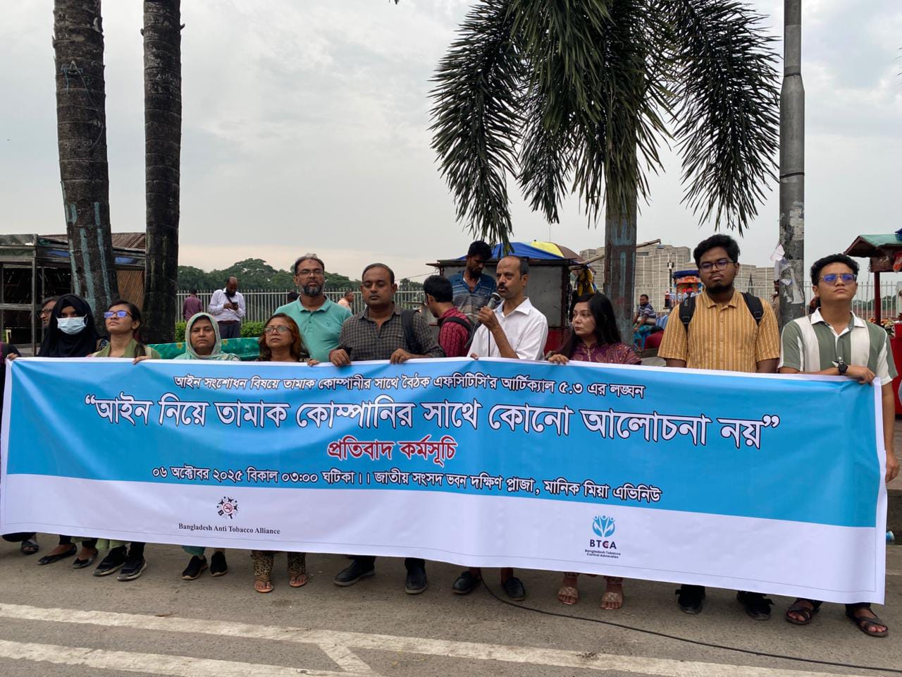 সরকারের পক্ষ থেকে তামাক নিয়ন্ত্রণ আইনটি সংশোধনের মাধ্যমে অধিকতর শক্তিশালী করার যে উদ্যোগ গ্রহণ করা হয়েছে তা অত্যন্ত প্রশংসার দাবীদার। কিন্তু তামাক কোম্পানিগুলো সরকারের জনস্বাস্থ্য রক্ষার এই মহান উদ্যোগকে ব্যাহত করতে মরিয়া হয়ে উঠেছে। তারা নিজেদের অংশীজন দাবী করে আইন সংশোধনে মতামত দিতে চাইছে যা সুস্পষ্টভাবে এফসিটিসি আর্টিকেল ৫.৩ এর লঙ্ঘন। এই বিষয়ের উপর গুরুত্ব দিয়ে আজ বাংলাদেশ টোব্যাকো কন্ট্রোল এডভোকেডস (BTCA) ও বাংলাদেশ তামাক বিরোধী জোট (BATA) এর যৌথ উদ্যোগে একটি প্রতিবাদ কর্মসূচি ও ভ্রাম্যমান ক্যাম্পেইনের আয়োজন করা হয়। উক্ত প্রতিবাদ কর্মসূচি ও ভ্রাম্যমান ক্যাম্পেইনের মাধ্যমে তামাক নিয়ন্ত্রণ বিষয়ক আইন, বিধিমালা বা নীতি প্রণয়নে তামাক কোম্পানি বা তাদের সহযোগীদের মতামত গ্রহণ না করাসহ ‘সব নীতিতে স্বাস্থ্যকে প্রাধান্য’ (Health in All Policies) বাস্তবায়নে আন্তঃমন্ত্রণালয় সমন্বয় জোরদার করার দাবি তুলে ধরা হয়। একইসাথে তামাক নিয়ন্ত্রণ আইন দ্রুত সংশোধনের মাধ্যমে শক্তিশালী করার আহ্বান জানানো হয়।