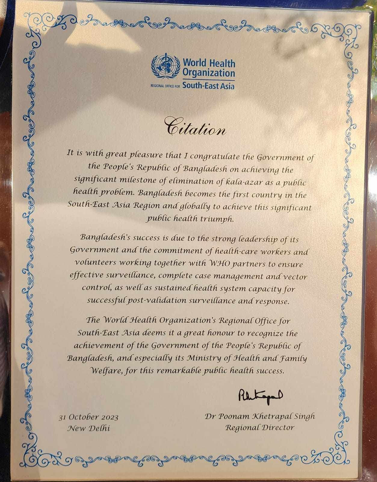 কালাজ্বর নির্মূলে বিশ্বের প্রথম দেশ হিসেবে স্বীকৃতি পেয়েছে বাংলাদেশ। আজ ৩১ অক্টোবর, সোমবার, দুপুরে ভারতের দিল্লীতে অনুষ্ঠিতব্য ৩০ অক্টোবর থেকে ২ নভেম্বর ৩ দিন ব্যাপী চলা বিশ্ব স্বাস্থ্য সংস্থার ৭৬-তম দক্ষিণ এশিয়ার আঞ্চলিক সম্মেলনে স্বাস্থ্য ও পরিবার কল্যাণ মন্ত্রী জাহিদ মালেক এমপি’র হাতে এই স্বীকৃতির সনদপত্র তুলে দেন বিশ্ব স্বাস্থ্য সংস্থার দক্ষিণ-পূর্ব এশিয়ার আঞ্চলিক পরিচালক পুনম খেত্রপাল। বিশ্ব স্বাস্থ্য সংস্থার মহাপরিচালক Dr. Tedros Adhanom Ghebreyesus এ সময় উপস্থিত ছিলেন।