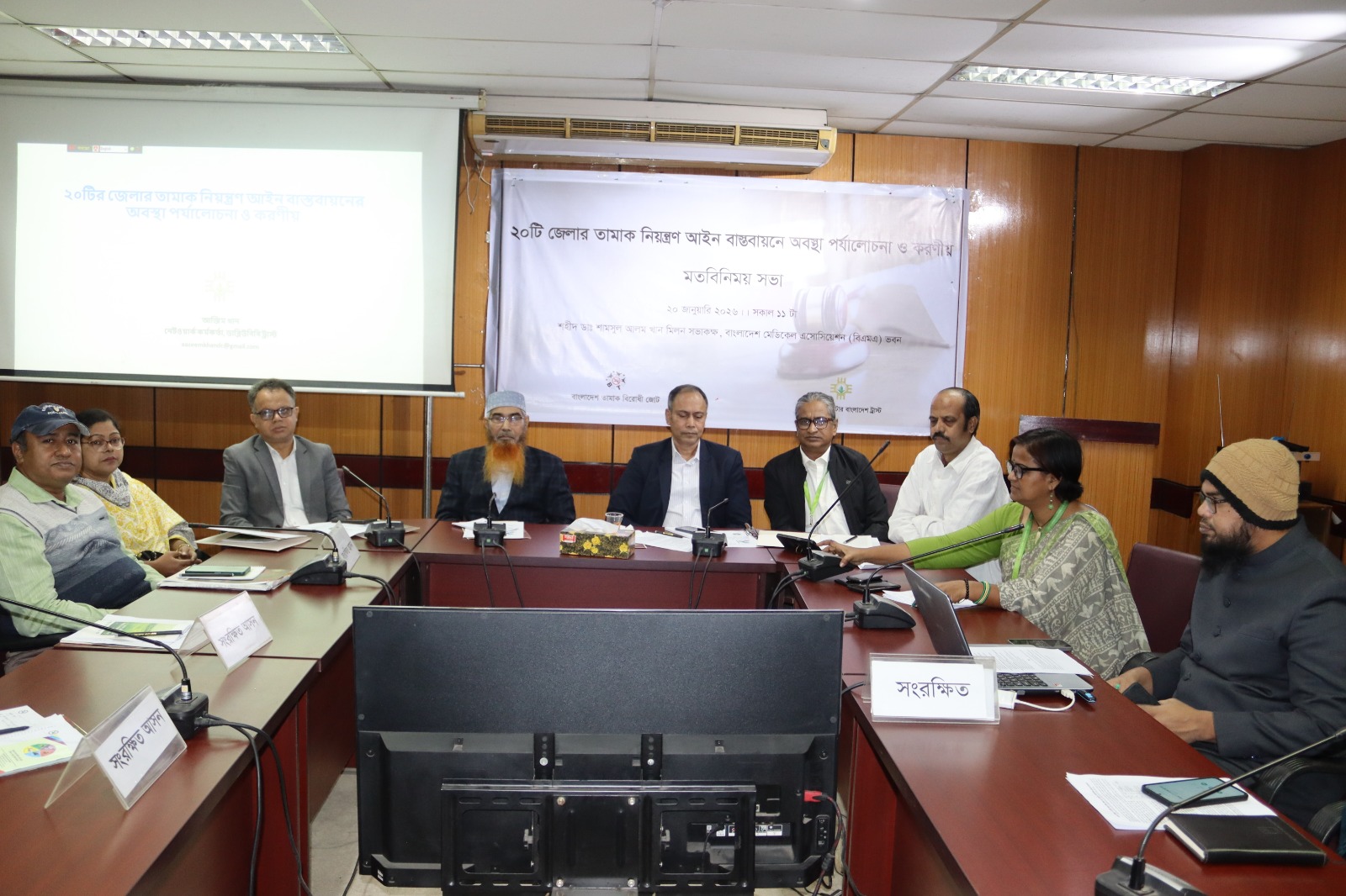 মঙ্গলবার (২০ জানুয়ারি) রাজধানীর বাংলাদেশ মেডিকেল অ্যাসোসিয়েশন (বিএমএ) ভবনের শহীদ ডা. শামসুল আলম খান মিলন সভাকক্ষে অনুষ্ঠিত “তামাক নিয়ন্ত্রণ আইন বাস্তবায়নে ২০টি জেলার অবস্থা পর্যালোচনা ও করণীয়” শীর্ষক মতবিনিময় সভায় এ দাবি জানানো হয়। সভার আয়োজন করে বাংলাদেশ তামাক বিরোধী জোট (বাটা) ও ওয়ার্ক ফর এ বেটার বাংলাদেশ (ডাব্লিউবিবি) ট্রাস্ট।
