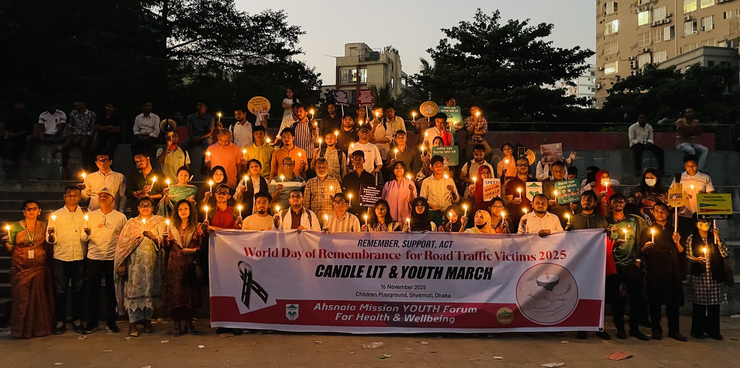 মোমবাতি প্রজ্বলন কর্মসূচিতে সড়ক দুর্ঘটনায় ক্ষতিগ্রস্থ ব্যক্তি এবং তাদের পরিবারের সদস্যরাসহ প্রায় অর্ধ শতাধিক তরুণ ও ঢাকা আহ্ছানিয়া মিশন স্বাস্থ্য সেক্টরের কর্মকর্তাগণ সহ নানা শ্রেণি-পেশার শতাধীক মানুষ অংশ নেয়। এসময় তারা বাংলাদেশের সড়ক দুর্ঘটনায় আহত-নিহতের সংখ্যা অর্ধেকে নামিয়ে আনতে একটি কার্যকর “সড়ক নিরাপত্তা আইন” এর দাবি জানান।