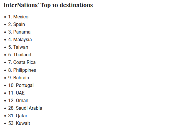 গতকাল মঙ্গলবার প্রতিষ্ঠানটি প্রবাসী র‌্যাঙ্কিং ২০২৩ প্রকাশ করেছে। এ তালিকায় প্রবাসীদের জন্য সবচেয়ে ভাল ও নিরাপদ জায়গা হিসেবে স্থান পেয়েছে মেক্সিকো। এর পরেই স্থান করে নিয়েছে যথাক্রমে স্পেন, পানামা, মালয়েশিয়া, তাইওয়ান, থাইল্যান্ড, কোস্টারিকা, ফিলিপাইন, বাহরাইন, পর্তুগাল, আরব আমিরাত ও ওমান। সৌদি আরব রয়েছে তালিকার ২৮ নম্বরে। এছাড়া কাতার ও কুয়েত রয়েছে তালিকার ৩১ ও ৫৩ নম্বরে।