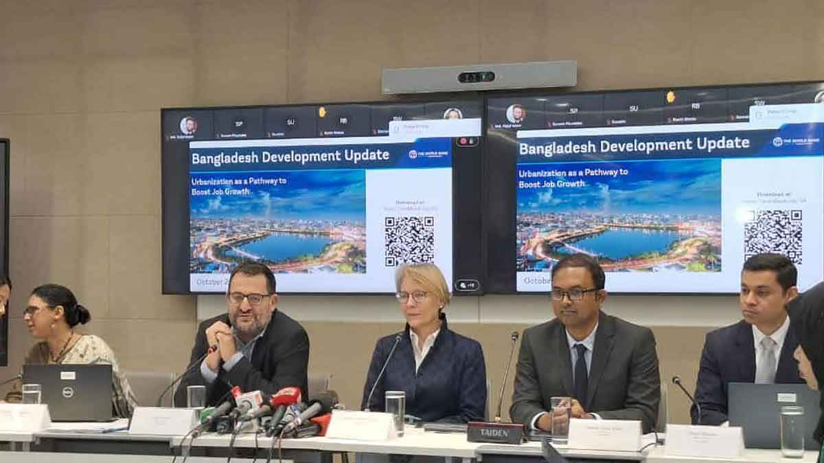মঙ্গলবার (৭ অক্টোবর) রাজধানীতে বিশ্বব্যাংকের বাংলাদেশ অফিসে আয়োজিত ‘বাংলাদেশ আপডেট’ শীর্ষক সংবাদ সম্মেলনে এসব তথ্য জানানো হয়। প্রতিবেদন অনুযায়ী, ২০২৫ অর্থবছরের প্রথম প্রান্তিকে নানা ব্যাঘাতের পরও পরবর্তী প্রান্তিকগুলোতে অর্থনৈতিক প্রবৃদ্ধি কিছুটা ঘুরে দাঁড়িয়েছে। বহিরাগত খাতের চাপ কমেছে, রিজার্ভ স্থিতিশীল হয়েছে এবং মুদ্রাস্ফীতি কিছুটা হ্রাস পেয়েছে।