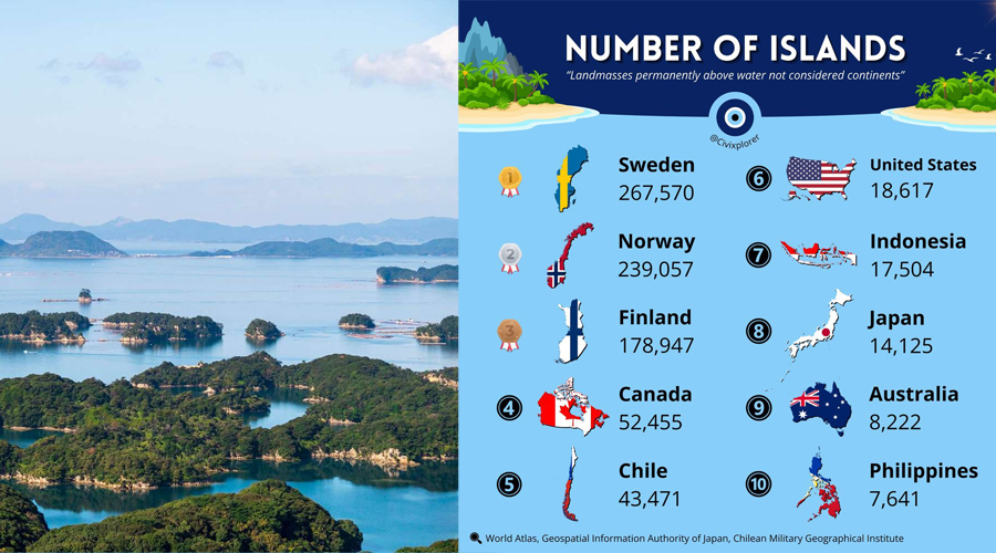 একটা সময় ছিল, যখন ভূগোল মানেই ছিল পাহাড়, নদী আর সমুদ্রের ম্যাপ ঘেঁটে দেখা। কিন্তু কেউ যদি বলে, একটি দেশ তার ভৌগোলিক সীমানার মধ্যে কয়েক লক্ষ দ্বীপ নিয়ে অবস্থান করছে—তবে অবাক হওয়ারই কথা। হ্যাঁ, বাস্তবে এমন একটি দেশ রয়েছে—সুইডেন। দেশটি বিশ্বে সবচেয়ে বেশি সংখ্যক দ্বীপের অধিকারী। বিশ্বব্যাপী দ্বীপের সংখ্যা অনুযায়ী শীর্ষ দশটি দেশের তালিকায় ইউরোপ, এশিয়া, আমেরিকা ও ওশেনিয়া মহাদেশের দেশগুলো রয়েছে, কিন্তু সবার উপরে সুইডেনই।