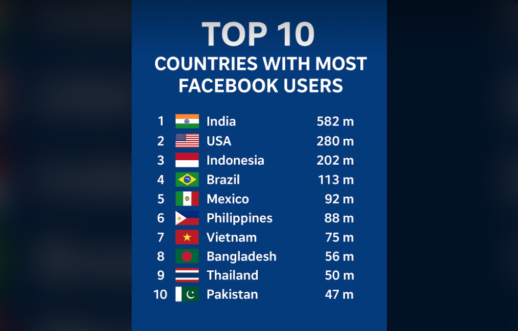 Statista–র ২০২৫ সালের পরিসংখ্যান অনুযায়ী, বিশ্বে সবচেয়ে বেশি ফেসবুক ব্যবহারকারীর দেশ ভারত। এরপর রয়েছে যুক্তরাষ্ট্র, ইন্দোনেশিয়া, ব্রাজিল, মেক্সিকোসহ আরও কয়েকটি দেশ। এই তথ্য কেবল সংখ্যা নয়, বরং একটি বৈশ্বিক প্রবণতার প্রতিফলন, যেখানে বোঝা যায় কিভাবে ফেসবুক মানুষের জীবনে ঢুকে পড়েছে। এবার একে একে দেখা যাক শীর্ষ ১০ দেশের অবস্থান।