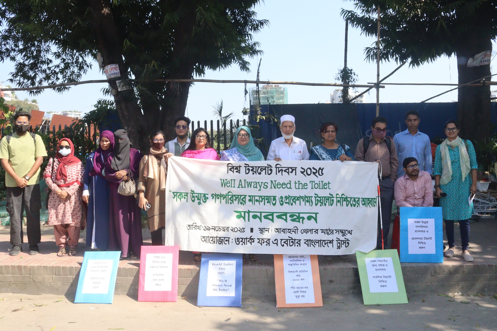 আজ ১৯ নভেম্বর ২০২৫ বুধবার সকাল ১১:০০ টায়, ধানমন্ডি সাত মসজিদ সড়কস্থ আবাহনী খেলার মাঠের সামনে ইনস্টিটিউট অব ওয়েলবীইং বাংলাদেশ, এবং ওয়ার্ক ফর এ বেটার বাংলাদেশ ট্রাস্ট- এর যৌথ উদ্যোগে আয়োজিত “সকল উন্মুক্ত গণপরিসরে মানসম্মত ও প্রবেশগম্য টয়লেট নিশ্চিতের আহ্বানে” শীর্ষক মানববন্ধন কর্মসূচি থেকে বক্তারা এ অভিমত ব্যক্ত করেন।