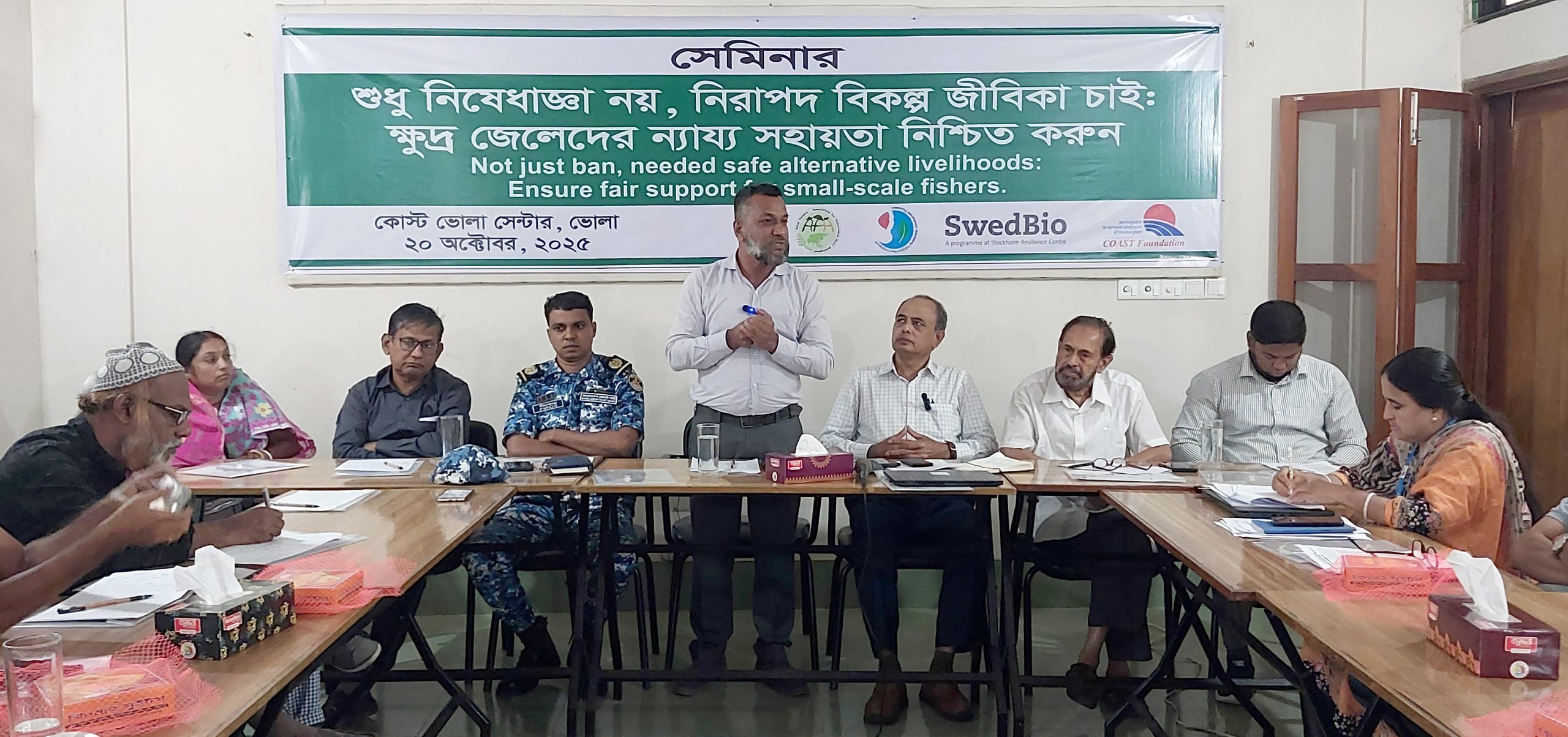 মোসাম্মাৎ রাশিদা বেগম, প্রকল্প সমন্বয়কারী, জিসিএ (GCA) প্রকল্প, কোস্ট ফাউন্ডেশন, মূল প্রবন্ধ উপস্থাপন করেন। তিনি জানান, ভোলার নিবন্ধিত জেলেদের প্রায় ৬০% প্রতিবছর নিষেধাজ্ঞার সময় ২-৩ মাস আয়হীন অবস্থায় থাকে।