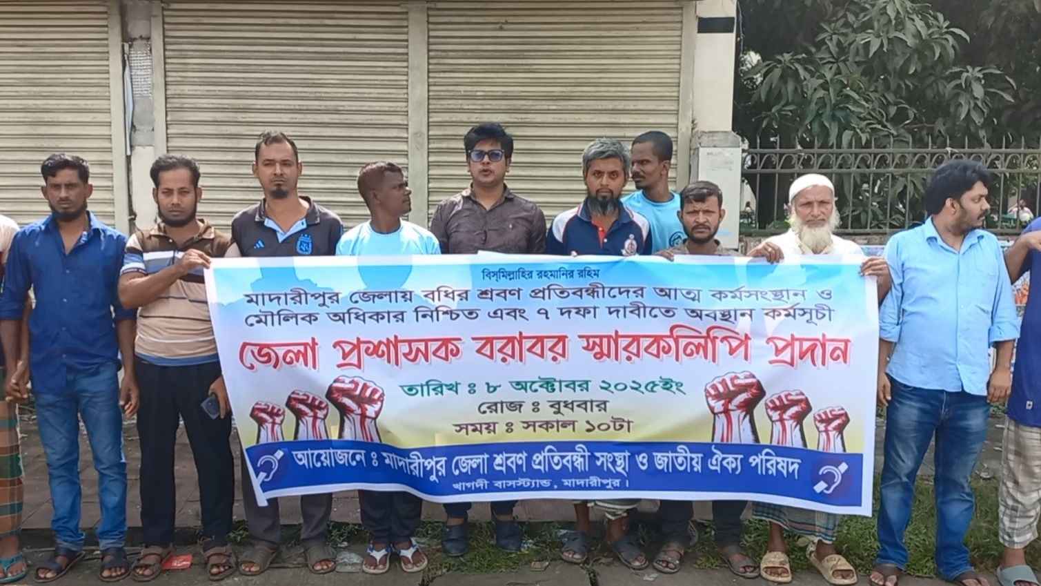মাদারীপুরে শ্রবণ বধির প্রতিবন্ধীদের আত্মকর্মসংস্থান, মৌলিক অধিকার নিশ্চিতসহ ৭ দফা দাবিতে মানববন্ধন অনুষ্ঠিত হয়েছে। বুধবার (৮ অক্টোবর) সকালে জেলা প্রশাসকের কার্যালয়ের সামনে এই কর্মসূচি পালন করা হয়। মাদারীপুর জেলা শ্রবণ প্রতিবন্ধী সংস্থার ও জাতীয় ঐক্য পরিষদের আয়োজনে এতে অংশ নেয় অর্ধশত প্রতিবন্ধী।
