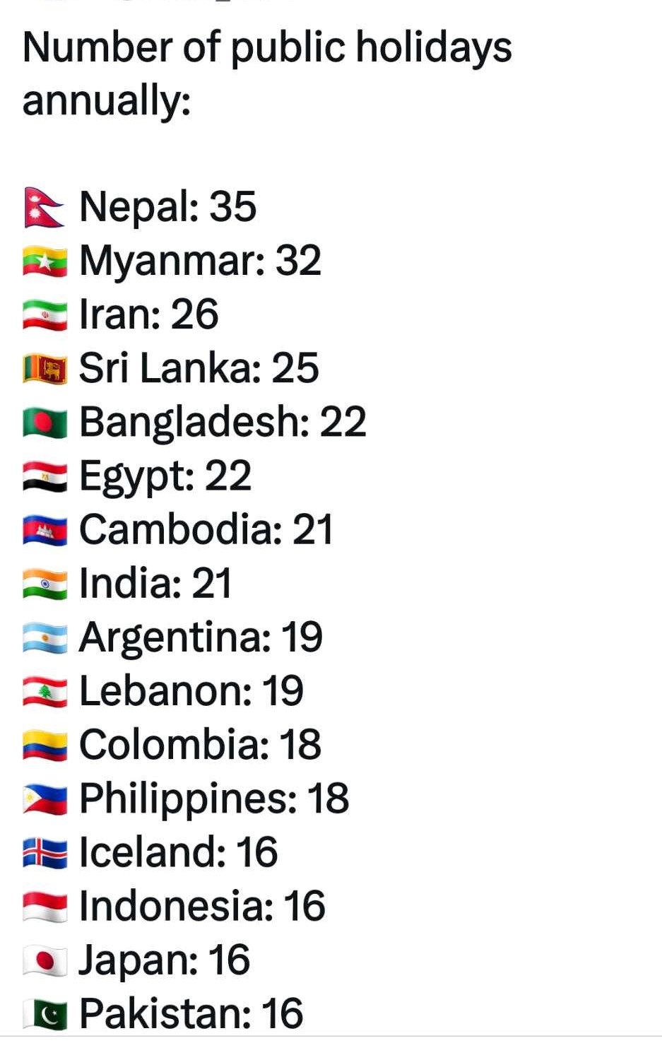 এছাড়া কম্বোডিয়া ও ভারতে ২১ দিন; আর্জেন্টিনা ও লেবাননে ১৯; কলম্বিয়া ও ফিলিপাইনে ১৮; আইসল্যান্ড, ইন্দোনেশিয়া, জাপান, পাকিস্তান, কাজাখস্তান ও থাইল্যান্ডে ১৬ দিন; অস্ট্রিয়া, চিলি, ডেনমার্ক, নরওয়ে, দক্ষিণ কোরিয়া, তুর্কি ও ভেনিজুয়েলায় ১৪ দিন; ফিনল্যান্ড, পোলান্ড, স্পেন ও চেক রিপাবলিকে ১৩ দিন; ইতালি, সুইডেন ও ইউক্রেনে ১২ দিন; চিন, ফ্রান্স, নেদারল্যান্ড, রাশিয়া, দক্ষিণ আফ্রিকা ও যুক্তরাষ্ট্রে ১১ দিন; অস্ট্রেলিয়া, জার্মানি ও কানাডায় ১০-১৩ দিন, বেলজিয়াম, এস্তোনিয়া ও আয়ারল্যান্ডে ১০ দিন, ব্রাজিলে ৯-১২ দিন, তাইওয়ানে ৯ এবং যুক্তরাজ্যে ৮-১০ দিন সরকারি ছুটি পাবেন কর্মজীবীরা।