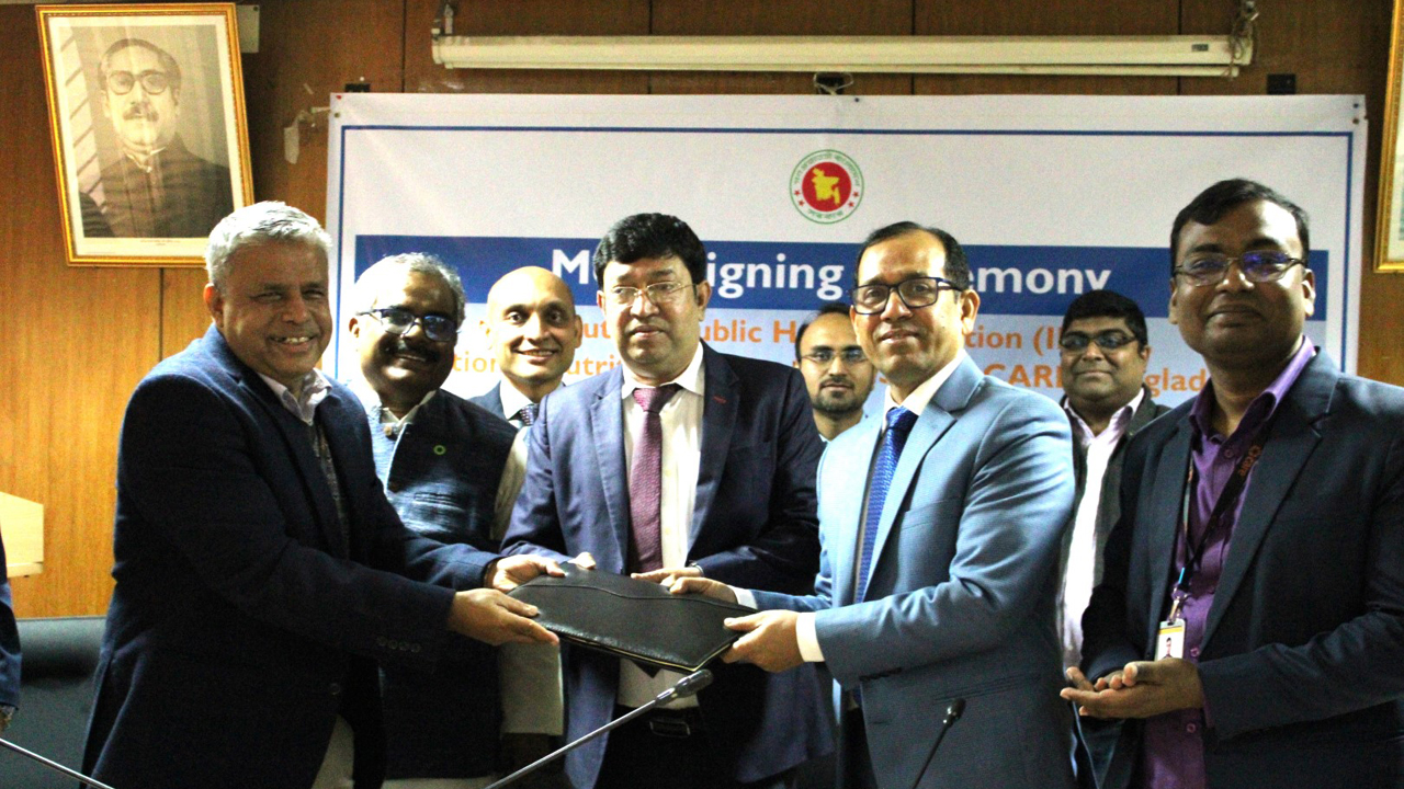 জনস্বাস্থ্য পুষ্টি প্রতিষ্ঠান এবং জাতীয় পুষ্টিসেবার সঙ্গে পাঁচ বছরের জন্য একটি সমঝোতা স্মারক (এমওইউ) স্বাক্ষর করেছে কেয়ার বাংলাদেশ। শ‌নিবার (১৮ জানুয়া‌রি) কেয়ার বাংলাদেশ এক সংবাদ বিজ্ঞপ্তিতে এ তথ‌্য জানায়।