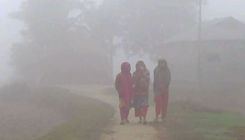 ঘন কুয়াশার মধ্যে ব্যাগ কাঁধে স্কুলে যাচ্ছে দুই শিক্ষার্থী