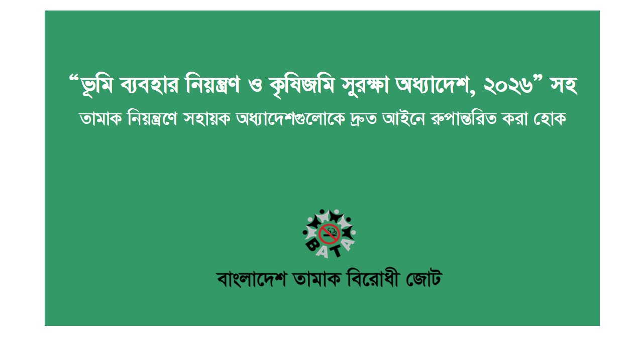 পরিসংখ্যান ব্যুরোর তথ্যানুসারে, দেশে জনসংখ্যা বৃদ্ধির ফলে প্রতি বছর ঘরবাড়ি নির্মাণসহ অকৃষি খাতে ১ শতাংশ হারে আবাদী জমি কমছে। সেখানে খাদ্য উৎপাদনের জন্য নির্ধারিত জমিতে তামাক চাষ বৃদ্ধি ভীষণ উদ্বেগের। তামাক চাষ নিয়ন্ত্রণ করা না গেলে এটি কৃষির জন্য মারাত্মক ঝুঁকি সৃষ্টি করবে। জনস্বাস্থ্য, পরিবেশ এবং অর্থনৈতিক সুরক্ষায় রাষ্ট্রীয়ভাবে শক্ত পদক্ষেপ গ্রহণ করা জরুরি। বাংলাদেশ তামাক বিরোধী জোট, কোন ধরণের অপপ্রচারে বিভ্রান্ত না হয়ে, চলমান সংসদ অধিবেশনে “ধুমপান ও তামাকজাত দ্রব্য ব্যবহার (নিয়ন্ত্রণ) (সংশোধন) অধ্যাদেশ ২০২৫”এবং “ভূমি ব্যবহার নিয়ন্ত্রণ ও কৃষিজমি সুরক্ষা অধ্যাদেশ, ২০২৬” সহ তামাক নিয়ন্ত্রণে সহায়ক অধ্যাদেশগুলোকে দ্রুত আইনে রুপান্তরিত করার আহবান জানিয়েছে তারা।
