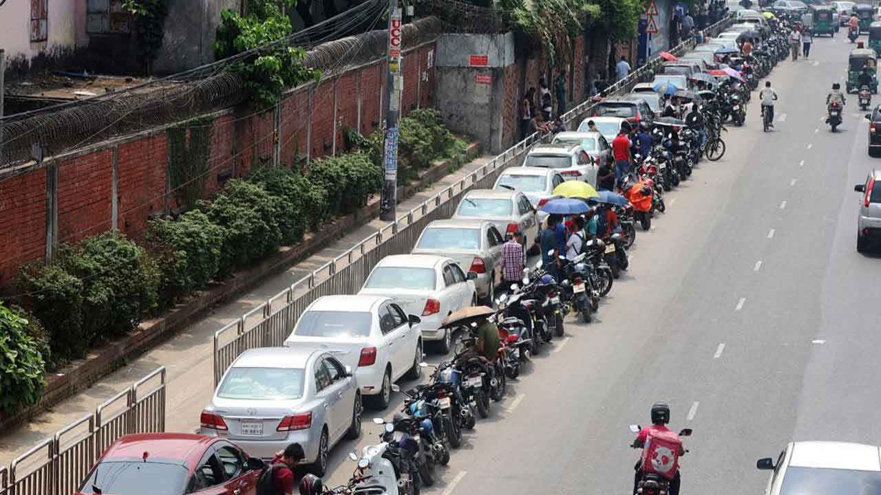 শনিবার (১৮ এপ্রিল) দুপুরে রাজধানীর মেরুল বাড্ডা থেকে শাহজাহানপুর পর্যন্ত সড়কে পেট্রোল পাম্পকেন্দ্রিক দীর্ঘ যানবাহনের সারি দেখা যায়। ব্যক্তিগত গাড়ি, বাস, ট্রাক ও মোটরসাইকেলসহ বিভিন্ন যানবাহন তেল সংগ্রহের অপেক্ষায় দীর্ঘ সময় দাঁড়িয়ে থাকে, এতে পুরো সড়কজুড়ে ধীরগতির যানচলাচল এবং কোথাও কোথাও স্থবির পরিস্থিতির সৃষ্টি হয়।