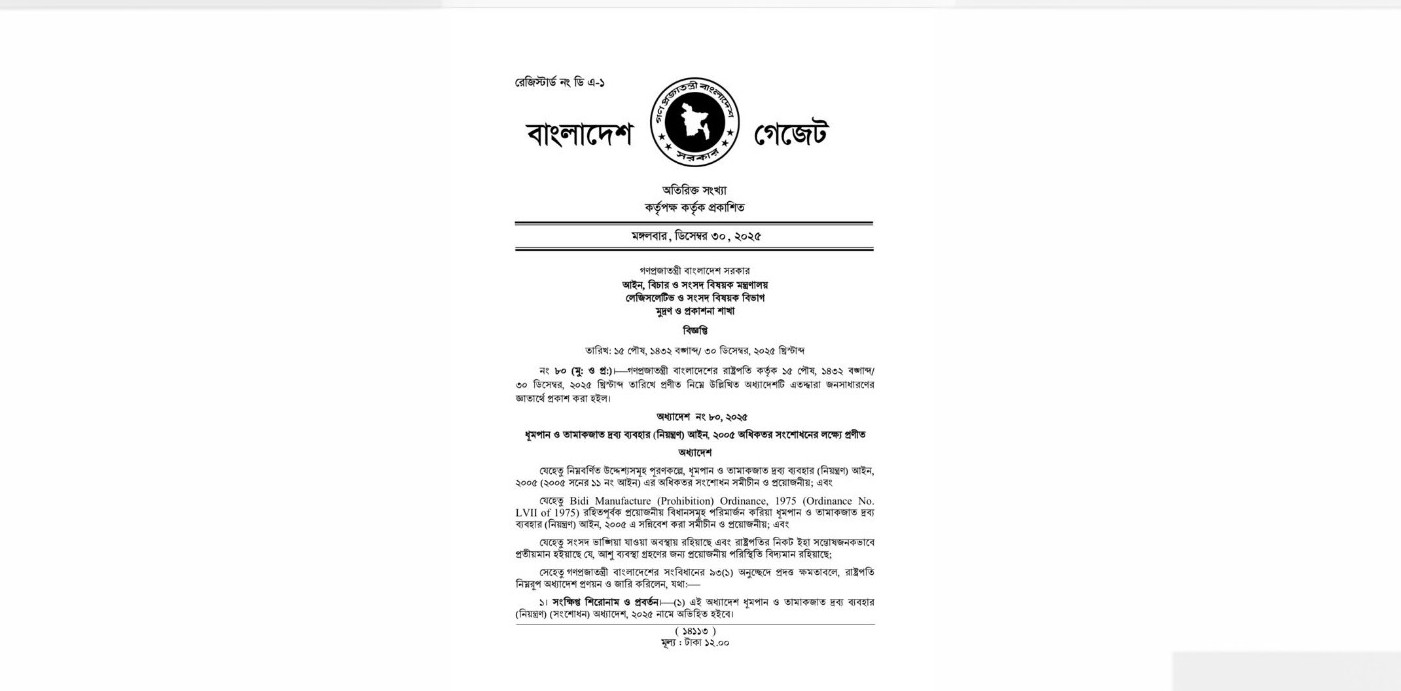 ধূমপান ও তামাকজাত দ্রব্য ব্যবহার নিয়ন্ত্রণে নতুন অধ্যাদেশ জারি করেছে সরকার। রাষ্ট্রপতির অনুমোদনের পর মঙ্গলবার (৩০ ডিসেম্বর) “ধূমপান ও তামাকজাত দ্রব্য ব্যবহার (নিয়ন্ত্রণ) অধ্যাদেশ, ২০২৫” গেজেট আকারে প্রকাশ করা হয়েছে।