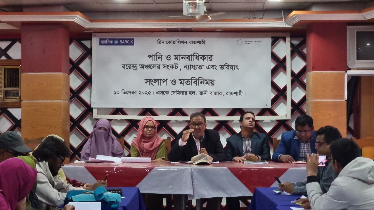 বক্তারা জোর দিয়ে বলেন, বরেন্দ্র অঞ্চলে ভূগর্ভস্থ পানির স্তর দ্রুত নিচে নেমে যাচ্ছে, গভীর নলকূপের মাধ্যমে কৃষি পানি উত্তোলন নিয়ন্ত্রণহীনভাবে বাড়ছে, এবং ঘন ঘন খরা দেখা দিচ্ছে। এর ফলে দরিদ্র পরিবারগুলোকে প্রতি লিটার পানির জন্য বাড়তি খরচ করতে হচ্ছে, যা নাগরিকদের মৌলিক অধিকারকে ঝুঁকির মধ্যে ফেলছে। পানি না থাকলে জীবনের অধিকারের বাস্তবায়ন অসম্ভব, খাদ্য নিরাপত্তা বিপন্ন, স্বাস্থ্য সুরক্ষা ভেঙে পড়ে এবং স্থানীয় অর্থনীতি টিকে থাকা কঠিন হয়।