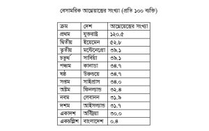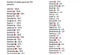 অন্যদিকে, জাপান ও দক্ষিণ কোরিয়ার মতো দেশে এই হার অত্যন্ত কম (প্রতি ১০০ জনে ০.৩-০.৫টি)। এসব দেশে অস্ত্র নিয়ন্ত্রণ আইন কঠোর হওয়ায় নাগরিকদের কাছে আগ্নেয়াস্ত্র থাকার হারও কম।