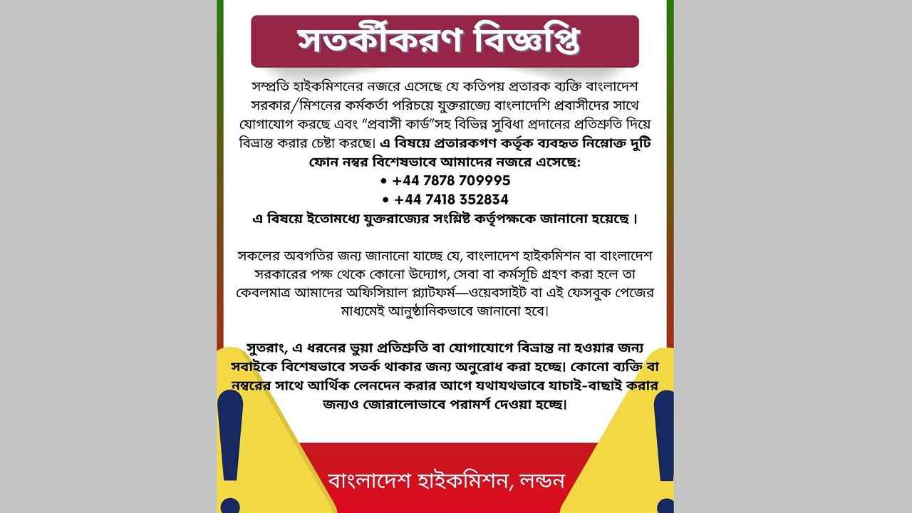 সতর্কবার্তায় আরও বলা হয়, বাংলাদেশ হাইকমিশন বা বাংলাদেশ সরকারের পক্ষ থেকে কোনো উদ্যোগ, সেবা বা কর্মসূচি গ্রহণ করা হলে তা শুধুমাত্র হাইকমিশনের অফিসিয়াল ওয়েবসাইট ও ফেসবুক পেজের মাধ্যমে আনুষ্ঠানিকভাবে জানানো হবে।