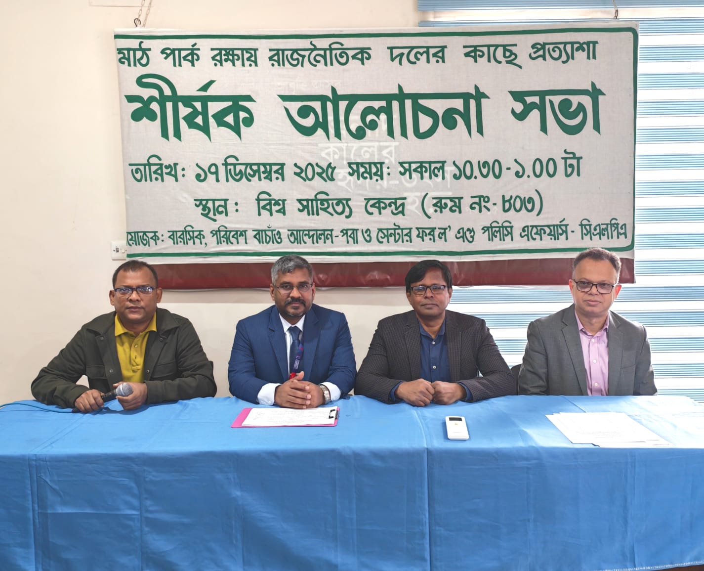 বুধবার (১৭ ডিসেম্বর) বিশ্ব সাহিত্য কেন্দ্রে বারসিক, সেন্টার ফর ল’ অ্যান্ড পলিসি অ্যাফেয়ার্স এবং পরিবেশ বাঁচাও আন্দোলন (পবা)-এর যৌথ আয়োজনে ‘মাঠ ও পার্ক রক্ষায় রাজনৈতিক দলের কাছে প্রত্যাশা’ শীর্ষক আলোচনা সভায় এসব অভিমত ব্যক্ত করা হয়।