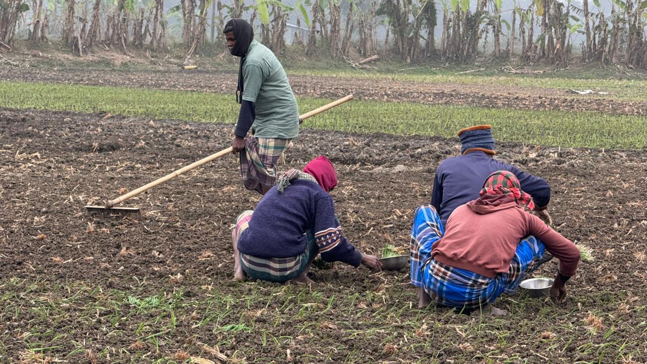সরেজমিনে দেখা যায়, কুয়াশাচ্ছন্ন পরিবেশে কৃষকেরা দলবদ্ধভাবে জমিতে পেঁয়াজের বীজ বপন ও চারা রোপণের কাজে ব্যস্ত। মাথায় গামছা বা টুপি, শরীরে মোটা জামা জড়িয়ে শীত থেকে বাঁচার চেষ্টা করলেও হিমেল বাতাসে কাজ করা কষ্টসাধ্য হয়ে উঠেছে। তবুও জীবিকার তাগিদে শীতকে উপেক্ষা করেই মাঠে সময় দিচ্ছেন তারা।