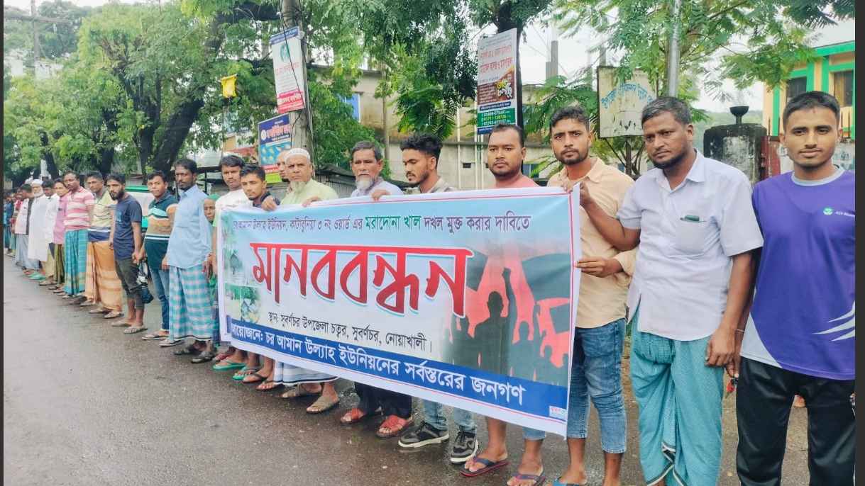 নোয়াখালীর সুবর্ণচরের চর আমান উল্যাহ ইউনিয়ন ও কাটাবুনিয়া ৩নং ওয়ার্ডের মারদোনা খাল দখলমুক্ত করার দাবিতে মানববন্ধন করেছেন এলাকাবাসী।