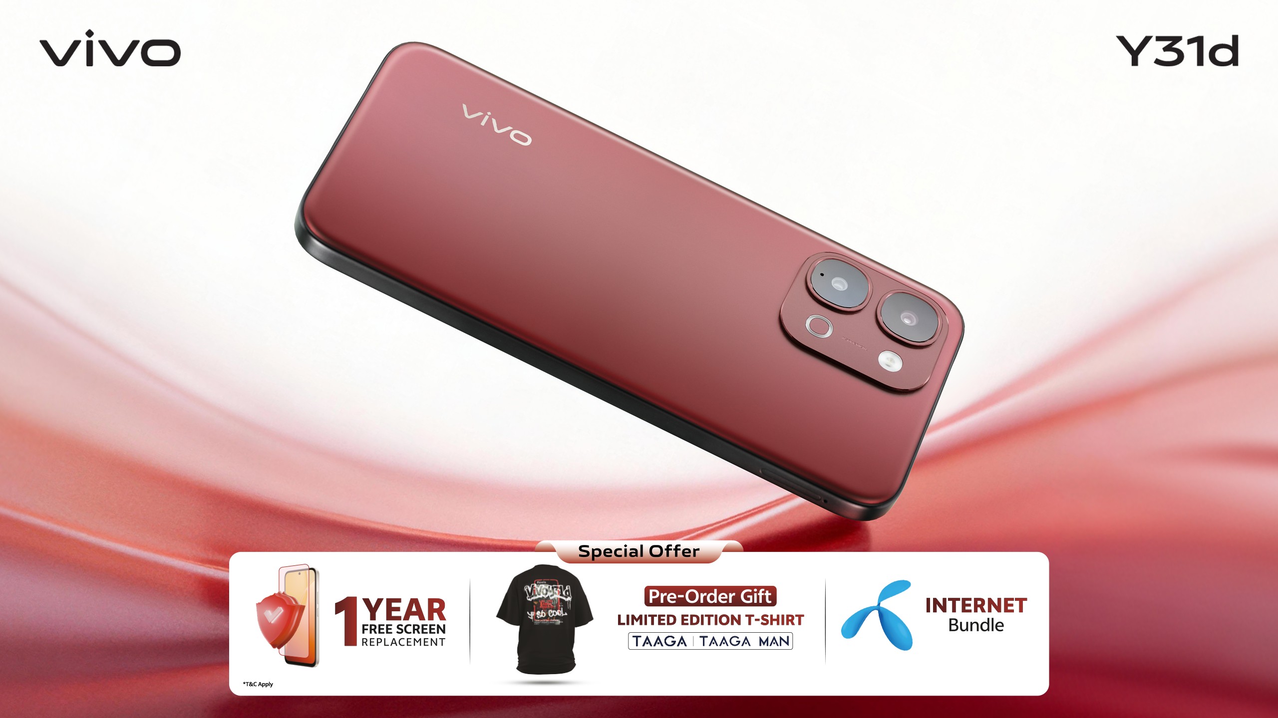 The Y31d comes in Festive Red, reflecting a warm, festive Ramadan vibe that feels premium, gift-worthy, and distinct from usual colors. It features a one-piece-like seamless design, a metallic camera module, and a quad-curved back cover for a comfortable in-hand feel.