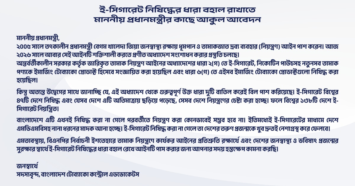 এমতাবস্থায়, বিএনপির নির্বাচনী ইশতেহারে তামাক নিয়ন্ত্রণে কার্যকর আইনের প্রতিশ্রুতি রক্ষার্থে এবং দেশের জনস্বাস্থ্য ও ভবিষ্যৎ প্রজন্মের সুরক্ষার স্বার্থে ই-সিগারেট নিষিদ্ধের ধারা বহাল রেখে আইনটি পাস করার জন্য আপনার সদয় হস্তক্ষেপ কামনা করছি।