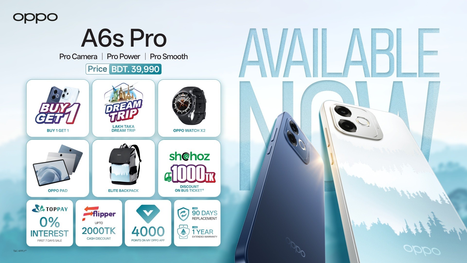 To make the purchase experience even more rewarding in this Eid, customers buying the OPPO A6s Pro can enjoy 0% interest instalment facilities through TOPPAY, receive an Elite Backpack as a complimentary gift, and benefit from a free 90-day replacement warranty along with a complimentary one-year extended warranty plan. In addition, customers can enjoy up to BDT 2,000 cash discount from Flipper and earn 4,000 reward points through the MY OPPO App.