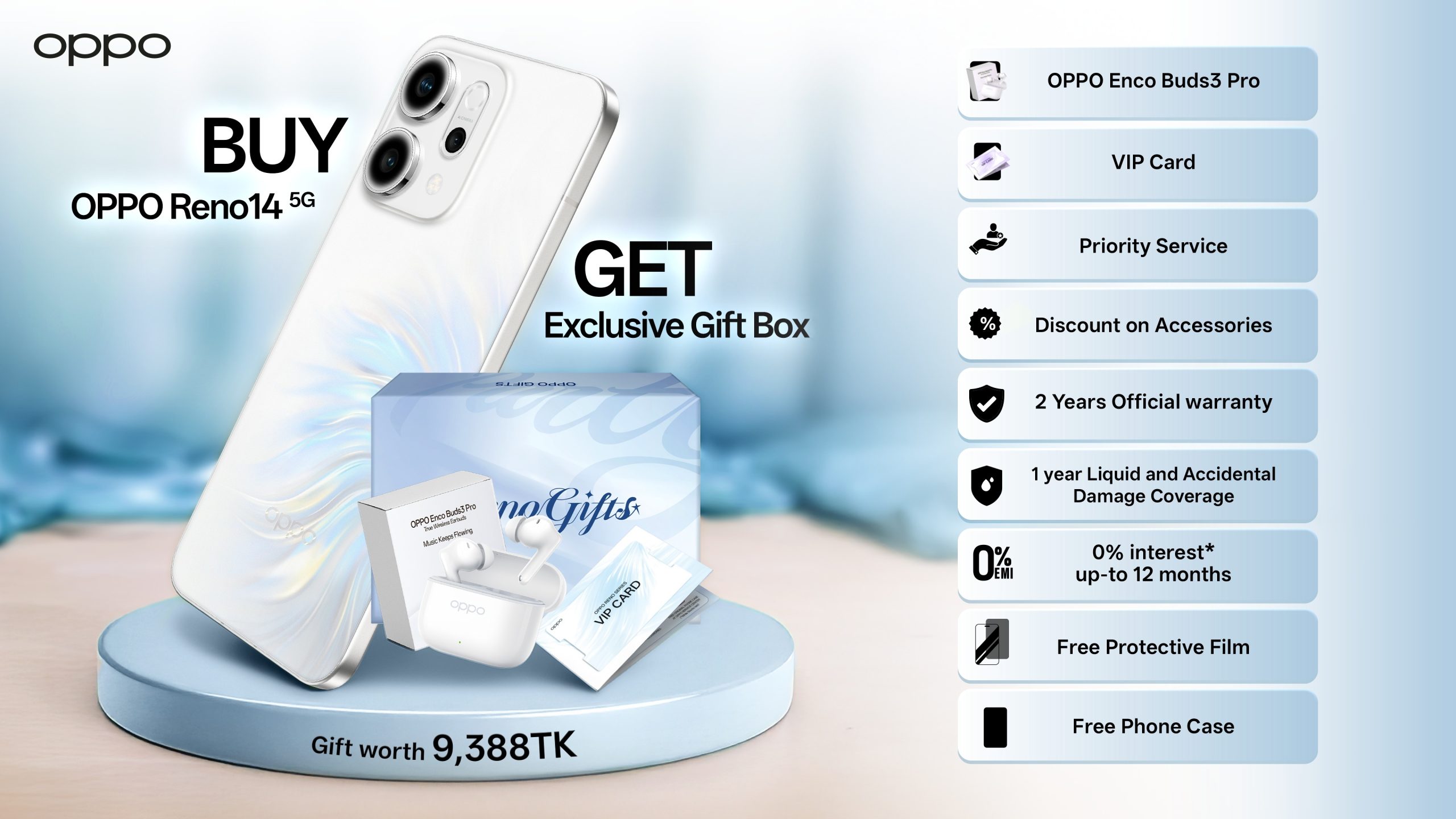 Under this offer, each Reno14 5G customer will enjoy a package of gifts and benefits valued at up to BDT 9,388. The rewards include OPPO Enco Buds3 Pro for superior sound, exclusive VIP cards with premium privileges, and the convenience of 0% EMI facilities for up to 12 months. Buyers are also entitled to two years of official warranty, priority service at OPPO service centers, and added protection through a free protective film and phone case. On top of that, OPPO is offering one-year free coverage against liquid and accidental damage along with attractive discounts on accessories. Together, these elements ensure that every customer not only takes home a cutting-edge AI smartphone but also enjoys complete peace of mind, long-term value, and added lifestyle benefits.