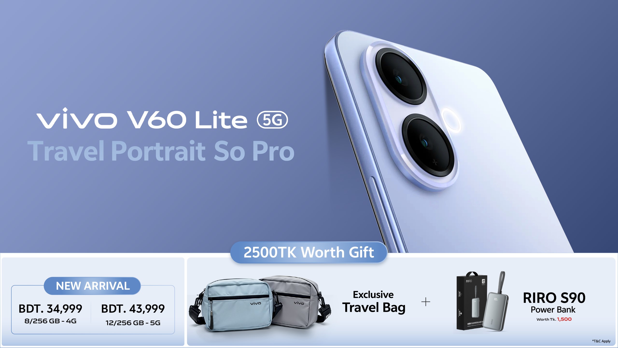 Now available in Bangladesh with attractive launch offers, the vivo V60 Lite comes in two variants – 5G at Tk 43,999 and 4G at Tk 34,999. Buyers also stand a chance to win a special gift pack worth Tk 2,500, featuring a stylish travel bag and a RIRO S90 power bank. In addition, the phone can be purchased through MOMO instalment plans starting from just Tk 7,000, with no credit card required.